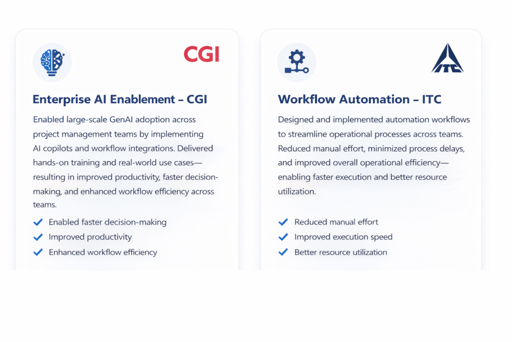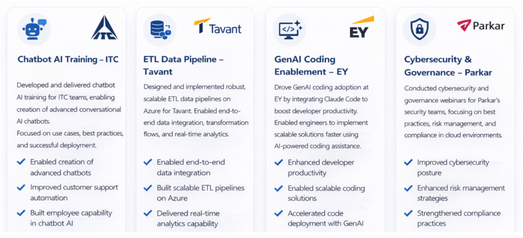 We partner with enterprises and global teams to design, implement, and scale AI-driven workflows, cloud systems, and automation solutions—delivering measurable business outcomes across operations, engineering, and data ecosystems.